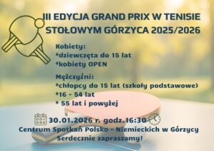 Zmiana terminu – III EDYCJA GRAND PRIX W TENISIE STOŁOWYM GÓRZYCA 2025/2026 8 stycznia 2026 Autor: Oliwia Bańka Uwaga❗️ ❗️Zmiana terminu❗️ III EDYCJA GRAND PRIX W TENISIE STOŁOWYM GÓRZYCA 2025/2026 odbędzie się 30.01.2026 r. 📅 Serdecznie zapraszamy!🏓